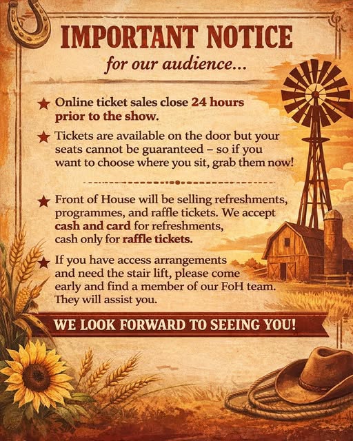 Just a little for your information before you join us…Online ticket sales close 24hrs before each show, and everything you need to know about tickets, refreshments and access is in the image above